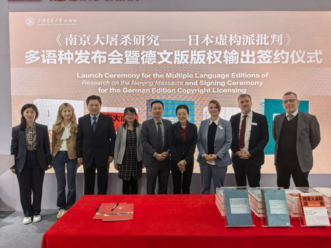 2025年10月15日,在第77届法兰克福书展上,研究院首席专家程兆奇的重要学术著作《南京大屠杀研究——日本虚构派批判》英、韩、日、俄四语种版本在活动上集中展示,德文版版权成功签约输出施普林格·自然集团(Springer Nature)。